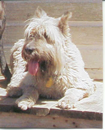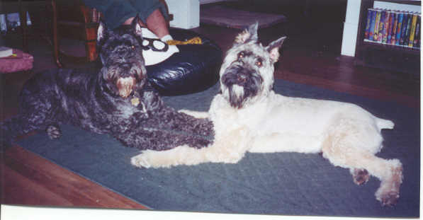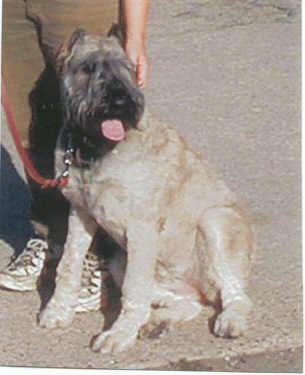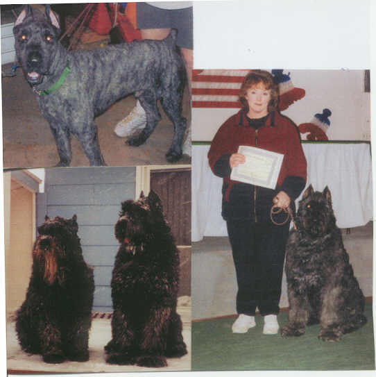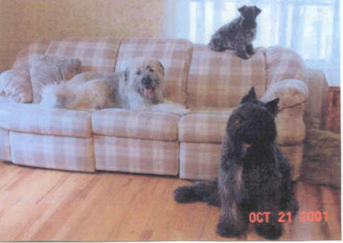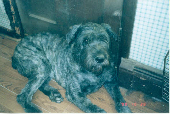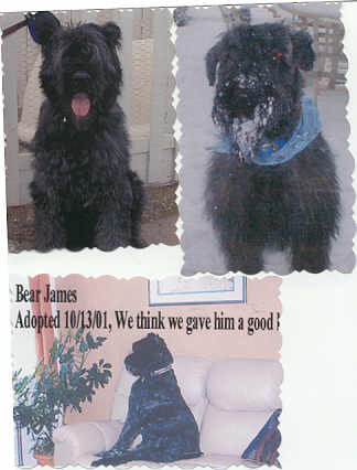 NAME: Bear (I) BREED: Bouvier des Flandres GENDER: Male (neutered) AGE: 3 yro WEIGHT: 69.6# COLOR: Dark gray brindle, docked and cropped. SURRENDERED: Mid July 2001 by family that could no longer care for him. PERSONALITY: Very good boy, house trained, good with kids, does not like cats, up to date on all shots. Bear (I) was previously adopted however diagnosed heartworm positive. We picked him up and successfully had him treated. Bear (I) has fully recovered. SPECIAL NEEDS: None. **UPDATE: - Adopted 10/13/01 by a wonderfull and caring family in Warren, MI **MOST RECENT UPDATE: Here are a couple of pictures of Bear I : original picture taken when adopted, " Mr. Snowy Beard" and the "King of the Couch". ![]() |