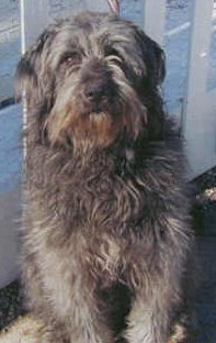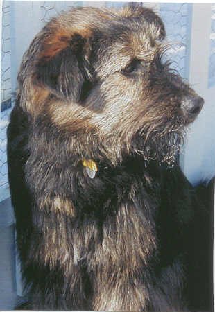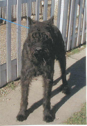 NAME: Harrison (renamed Navarre) BREED: Bouvier des Flandres GENDER: Male (neutered) AGE: Approx 9 months old WEIGHT: 50#? COLOR: Dark gray brindle, natural ears and tail RESCUED: From Sioux Falls SD Humane Society. Was dropped off by a mail box and remained there for two days patiently waiting for his family to come back for him - which they never did. PERSONALITY: A real challenge. Keeps Sheila on her toes at all times. SPECIAL NEEDS: None. Up to date on all vaccinations. **UPDATE: - Adopted by Sheila Mathers in Minneapolis, MN who went to Sioux Falls SD to pick him up for us and fell in love with him. |