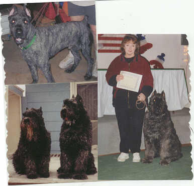 NAME: Jock (renamed Jake) BREED: Bouvier des Flandres GENDER: Male (neutered) AGE: 2 yrs 1 month old WEIGHT: 79# COLOR: Silver/gray brindle, docked tail & cropped ears RESCUED: 8/25/01 from Humane Society of Indianapolis. Surrendered by owner because he wasn't aggressive enough. PERSONALITY: Very alert, minds well, active, friendly and trusting. Loves giving "doggie kisses". Walks well on leash. Rides well in car. Heartworm negative, house trained. SPECIAL NEEDS: None. Up to date on all shots. **UPDATE: - Adopted by long-time Bouv family in Great Falls, MT - joined new family and two new sisters 10/19/01. **MOST RECENT UPDATE: Isn't this a beautiful picture? Jake (formerly Jock), his brother Kodi (also one of our rescues), his two Bouv sisters Keyto and Blaze and some of his two legged family. ![]() |
