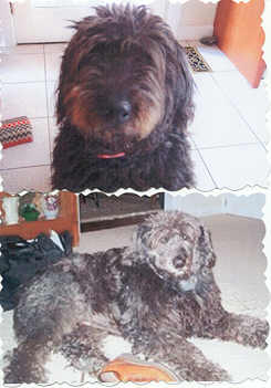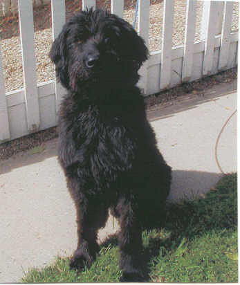 NAME: Baloo BREED: Bouvier mix GENDER: Male (neutered) AGE: 1 yro WEIGHT: 50# - 60# COLOR: Black, natural tail and ears SURRENDERED: 9/5/01 By a woman that had him about 6 months and had to give him up. PERSONALITY: Very friendly, gets along well with children, adults and other dogs. Woman said that he does get along with cats - which is rare - but he is still young. Said he was a Bouv/Newfie mix (looks like he could be a Bouv/Standard Poodle mix the way his hair is cut). Housetrained and very playful SPECIAL NEEDS: None. **UPDATE:On 9/9/01 Baloo was adopted by a wonderful family in Rockford, MI. He went to his forever home to join his new sister "Morgan" (10 mo Bouv/Golden Retriever mix) who is also a rescue and two kitties. |