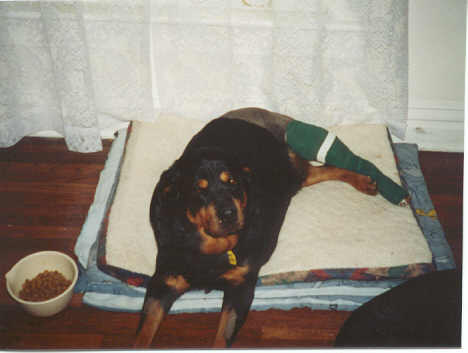 NAME: Mimi BREED: Rottweiller GENDER: Female AGE: 6 yro COLOR: Black, brown, docked tail RESCUED FROM: Genessee County Humane Society (found in a ditch unable to get up) PERSONALITY: A real sweetheart of a dog. Loves attention, people, and children SPECIAL NEEDS: None. **UPDATE: - We found out both of Mimi's rear knees were blown out and needed replacement. The Goslas (parents of Rupert & Taylor) fostered Mimi and cared for her during her recuperation. Mimi was adopted by John Ousnamer 04/29/01. |
