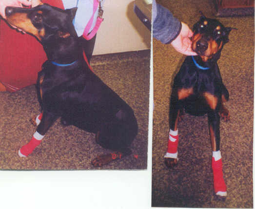 NAME: Missy BREED: Doberman Pinscher GENDER: Female (spayed) AGE: 18 months COLOR: Black & tan, cropped and docked RESCUED: PERSONALITY: Missy is not trying to make a fashion statement with her red ankle bracelets - she was hit by a car. She has fully recovered with no problems or side effects. She is up to date on all of her shots and ready to be welcomed into her new "Forever" home. SPECIAL NEEDS: None. **UPDATE: - Adpoted through Dobe Rescue |