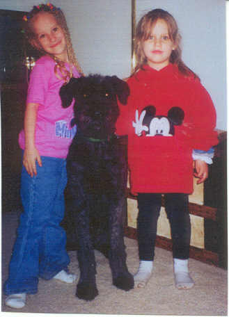 NAME: Yogi BREED: Bouvier des Flandres GENDER: Male (neutered) AGE: Born 09/06/96 COLOR: Black, natural ears, docked tail SURRENDERED: 03/12/01 By owner in Evansville, IN PERSONALITY: Very lovable, gets along great with other dogs and children. SPECIAL NEEDS: None. **UPDATE: - Adopted 04/08/01 by family in Almont, MI. Here is a picture of Yogi with his new "forever kids" Sara & Emily. Yogi got to go to the daughters preschool "Pet Day" and handled it very well. He loves the lake and everyone is doing just fine. |