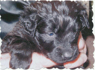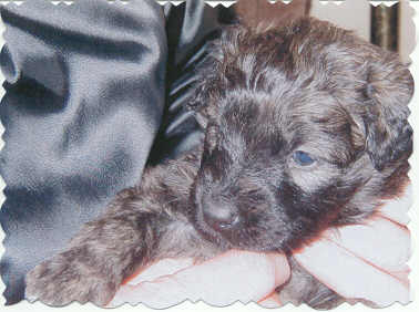 NAME: Noir (renamed Dutchess) BREED: Bouvier mix GENDER: Female AGE: Born 1/21/03 WEIGHT: COLOR: Black/brindle, natural ears and tail PERSONALITY: Noir was one of eleven puppies born on 1/21/03 to a purebred Bouvier, Dutchess, that happened to have been very pregnant when we rescued her. **UPDATE: Adopted 3/18/03 by a very caring and loving family in Royal Oak, MI. The grandchildren came out to see her on their initial meeting and wanted desperately to take the day off from school to help their Grandma and Grandpa pick up their new puppy. |