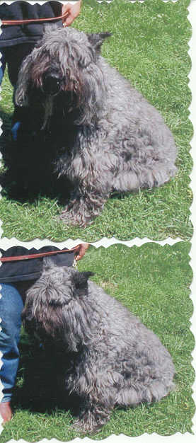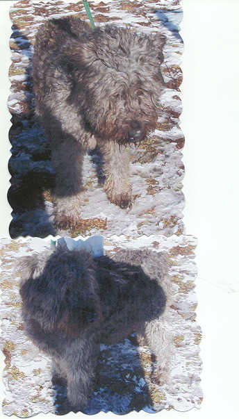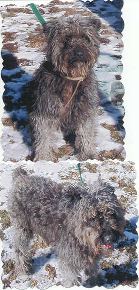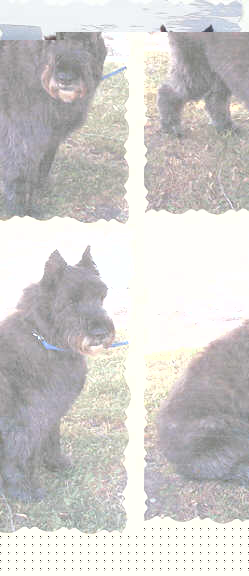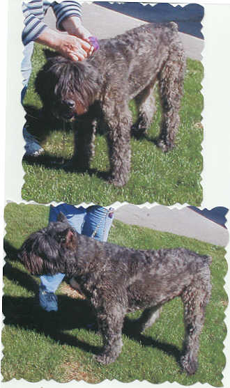 NAME: Chaka-Zulu BREED: Bouvier des Flandres GENDER: Male (neutered) AGE: 5 yro. WEIGHT: COLOR: Dark gray, docked tail, natural ears. RESCUED: PERSONALITY: Housetrained. Very shy and depressed. His owner went away and he was left behind. A very caring neighbor brough him to us. He was so depressed, stress out and confused when he first arrived - he cannot understand why he was abandoned. UTD on all vaccinations. Not cat friendly. **UPDATE: Chaka was adopted 12/26/03 by a very Bouvier saavy and superb family in Leonard, MI. They had just recently had to say goodbye to one of our former rescues, Toby, who they dearly loved prior to crossing the Rainbow Bridge. They had been coming out to the farm for regular "get acquainted" visits and Chaka seems to have let them into his private and lonely little world that was forced upon him when he lost his former master. These wonderful people would not give up on him and decided to take it slow and easy and give Chaka all the time and room he needed to accept them - and it looks like it has worked. |