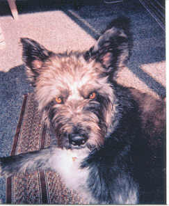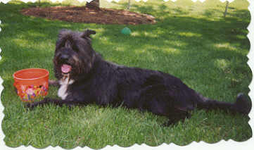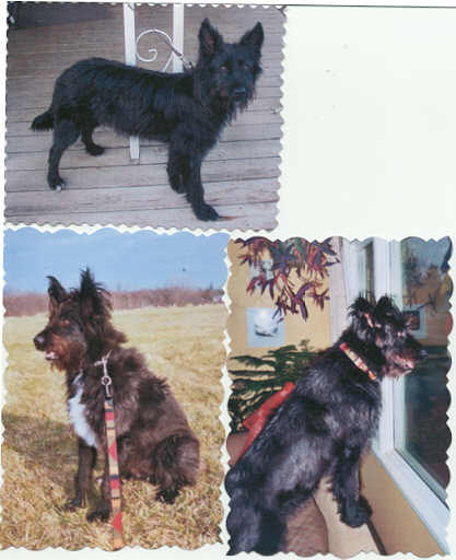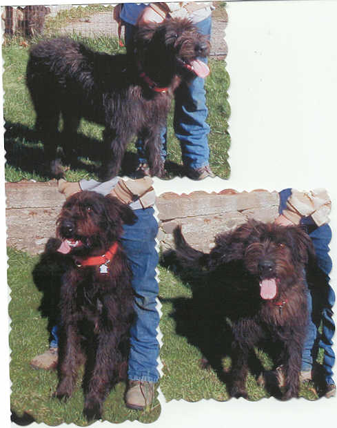 NAME: Dusty BREED: Bouvier/Bearded Collie mix GENDER: Male (to be neutered) AGE: 2-3 yor. WEIGHT: COLOR: Black brindle, natural tail & ears, white bib on chest RESCUED FROM: Genesee County Humane Society as a stray PERSONALITY: Very lovable and bouncy. Very alert and agile. Appears to get along well with children and other dogs. Housetrained, very neat and clean. UTD on vaccinations. Not cat friendly. **UPDATE: Dusty was adopted by a very loving family in Lindenhurst, IL. **MOST RECENT UPDATE: Received a newsletter from Dusty along with a bunch of wonderful pictures from his new Mom. He has turned into a real "magician" making things disappear. Like a 9x13 cake waiting to be frosted, cinnamon bread, squash, oranges - there is no limit to his imagination and taste buds. Otherwise he is adjusting quite well and is loved by all. **RECENT UPDATE: Here is a picture of Dusty on "his" porch off the kitchen where he enjoys an occasional bone and also likes to nap when it's cool outside. This picture shows off his beautiful eyes very nicely. ![]() ![]() |