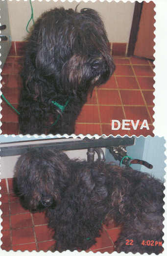 NAME: Deva BREED: Bouvier des Flandres GENDER: Female (spayed) AGE: 1 1/2 - 2 years young WEIGHT: 40# COLOR: Gray brindle, docked and cropped RESCUED: from Detroit Animal Control - picked up as a stray PERSONALITY: Possibly housetrained. Rides well in car. Still a little shy but warms up gradually. Gets along well with other dogs. UTD on vaccinations. Not cat friendly. **UPDATE: Deva was adopted 3/18/03 by the same very special woman in Medora, IN that adopted little Tinkerbell. |