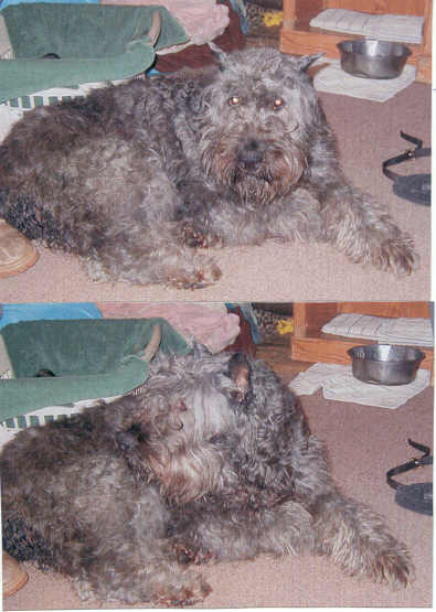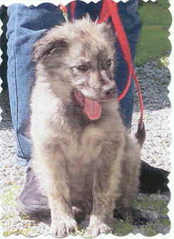 NAME: Lily II BREED: Bouvier/Aussie Mix? GENDER: Female (spayed) AGE: 2-2 1/2yro COLOR: Silver/Gray with white chest blaze, natural ears & tail & black tongue spot SURRENDERED: 10/20/02 by family in Harper Woods, MI - did not get along with their other dogs. PERSONALITY: Housetrained, very playful, walks well on leash. She has the most captivating crystal blue eyes, such a stunning contrast against her silver/gray hair. We have had no problems with Lily getting along with any of our rescues. Possibly her three former companions did not want to let her into their circle, and she kept trying to be accepted. UTD on vaccinations. Not cat friendly. **UPDATE: Lily II was adopted 3/22/03 by a very loving family in Green Bay, WI. They noticed her last fall, she was adopted elsewhere and came back due to allergies, as soon as they saw she was available again they said they desperately wanted her before anyone else adopted her again. **MOST RECENT UPDATE: Here are a couple of pictures of Lily II "Blue Eyes" with her Mom and Dad. ![]() |