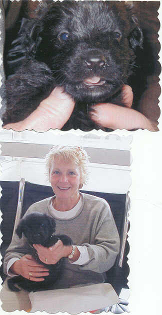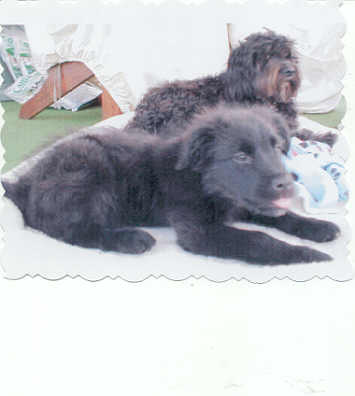 NAME: Ebony (renamed Nellie) BREED: Bouvier mix GENDER: Female AGE: Born 1/21/03 WEIGHT: COLOR: Black, natural ears and tail PERSONALITY: Ebony was one of eleven puppies born on 1/21/03 to a purebred Bouvier, Dutchess, that happened to have been very pregnant when we rescued her. She is solid black with a little "mothers milk kiss on her bottome chin. Very alert, loving and bouncy - a real cuddle bunny. **UPDATE: Nellie's new Mom flew into Detroit Metro on 3/19/03 to pick up her "precious cargo" and returned with her to East Greenwich, RI where she will join her new Dad and four-legged brother Fogarty. Nellie went home in style in her red padded carrier that was well equipped with toys, chewies and her brother Fogarty's favorite blanket. **MOST RECENT UPDATE: Here is the most recent pictures of Ebony (renamed Nellie) with her rescue brother Fogarty. It looks like she is giving the "raspberries" to the photographer :-) ![]() |