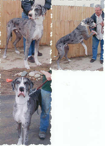 NAME: Geronimo BREED: Great Dane GENDER: Male (neutered) AGE: 2yro WEIGHT: 120# COLOR: Blue-Merle, natural ears and tail RESCUED FROM: 3/18/03 from Genesee County Humane Society PERSONALITY: Very loving "hunka hunka burning love"!! Housetrained, walks well on leash, has had former training. **UPDATE: Adopted 3/18/03 by one of the vet techs at one of the vets that we use. They had just recently lost their female Great Dane and fell in love with Geronimo when she first saw him. |