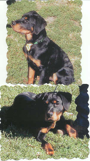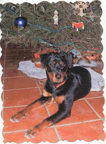 NAME: Magnum BREED: Rottweiller GENDER: Male (neutered) AGE: Born 3/14/03 WEIGHT: # COLOR: Black & Brown, docked tail, natural ears, dew claws removed SURRENDERED: By family that was used to having "laid-back Labs" and didn't realize the difference in a puppy and a mellow Lab. PERSONALITY: Housetrained. Attended puppy class, knows basic commands. Minds well. Could be food-aggressive with other dogs if not supervised while eating. Very people friendly. Have not had any problems with children and other dogs in foster situation, but prefer a home without Dogs or Children. Must be adopted out to an experienced Rotteweiller owner that is aware of the needs and personality of the breed. House pet ONLY - not guard dog or out-door dog. Must have completely fenced in yard. Will make the right person a wonderful, loving companion. UTD on vaccinations. Not cat friendly. **UPDATE: Adopted ba a very experinced and loving Rottweiller person in Canon City, CO **RECENT UPDATE: Well, can you tell who is anxiously awaiting the arrival of Santa Paws? This is Magnum's first and best Christmas ever in his new home with his wonderful new forever Mom. He is doing very well and has settled in very nicely. ![]() |