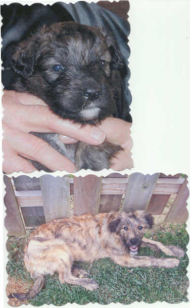 NAME: Tinkerbell BREED: Bouvier mix GENDER: Female AGE: Born 1/21/03 WEIGHT: COLOR: Fawn/gray/brindle, natural ears and tail PERSONALITY: Tinkerbell was one of eleven puppies born on 1/21/03 to a purebred Bouvier, Dutchess, that happened to have been very pregnant when we rescued her. She was the tiniest of all eleven puppies and had to be hand fed until able to nurse on her own. **UPDATE: Adopted 3/19/03 by a very special, compassionate and loving woman in Medora, IN that we were blessed to have finally met. She drove up to spend a couple of days with TInkerbell (and also adopted Deva - see above) before taking them both to their new forever home. **MOST CURRENT UPDATE: Isn't she gorgeous? She is going to look so much like her Mom, Dutchess. We have received nothing but wonderful updates on Tinkerbell from her new family. ![]() |