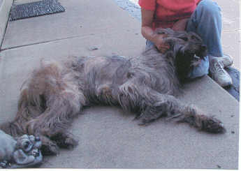 NAME: Dutchess BREED: Bouvier des Flandres GENDER: Female (to be spayed - currently pregnant) AGE: 4 Years Young WEIGHT: COLOR: Gray brindle, docked & cropped SURRENDERED: By man in Grand Rapids area. Original owner moved and left dogs behind. PERSONALITY: Housetrained. Very good natured. Good with older children. Rides well. Gets along well with other dogs. She will be having puppies sometime this month. Turned in with her sister, Schmay - can only be adopted together. UTD on vaccinations. Not cat friendly. **UPDATE: Both Dutchess & Schmay were adopted by a very compassionate family in Warren, MI. Because Dutchess has not delivered her puppies yet, they will bring Schmay out to see her sister every weekend until she has recouperated enough to leave her puppies. **MOST RECENT UPDATE: Here is a picture of one tired new Mommy that gave birth to ELEVEN puppies, 3 males and 8 females on 1/21/03 (see pictures of Mother and babies under Available Wannabees). Mother and puppies are all doing fine. ![]() |