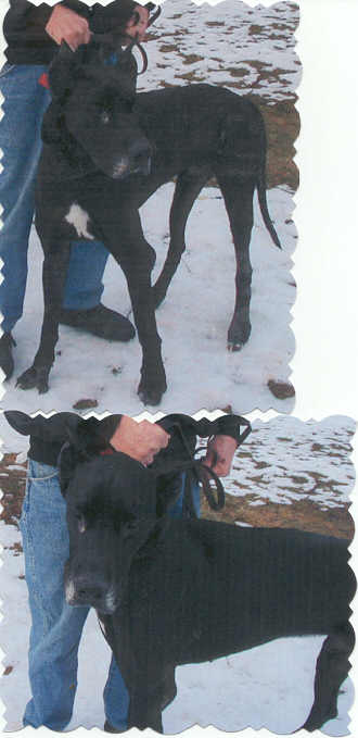 NAME: Smokey II BREED: Great Dane GENDER: Male (neutered) AGE: 4 - 5 yro. WEIGHT: # COLOR: Black w/white chest blaze, beautifully docked ears and natural tail RESCUED: 12/10/02 GCAC. He was in such a small crate that he couldn't even stand or turn around. PERSONALITY: Very well mannered. Gets along great with older children and adults. Because of size would not recommend with toddlers. Depending on situation might be better as only dog. Possibly due to lack of attention, does not want to share attention with other dogs. Walks well on leash. Housetrained. Appears to have had some training. Not good with cats. UTD on all vaccinations. **UPDATE: Smokey has been adopted through Great Dane Rescue Inc. Ontario Canada |