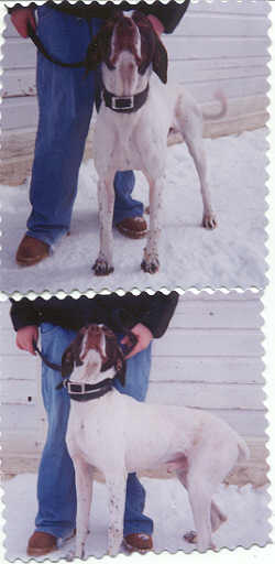 NAME: Buddy BREED: Pointer GENDER: Male (neutered). AGE: 3-4 Years Young (?). WEIGHT: 70# COLOR: White with dark brown face, nose, ears and lips - slight freckling on front legs. RESCUED: We found him huddled in a snowdrift on the side of the road, scared, cold and hungry. PERSONALITY: Hi, my name is Buddy and I have been on the rescue farm for about a year. I am obedience trained and mind very well. I am housetrained and get along well with other dogs and older children. As much as I love it on the farm and am grateful that they saved me from freezing to death - I sure would love to have a home and family that I could call my own. I am much prettier in person than the pictures show - after all it was awful cold when these pictures were taken. Please give me a chance - you won't regret it. Completely fenced and secured yard required. UTD on all vaccinations. Not cat friendly. **UPDATE: Buddy was finally adopted 10/8/05 by a wonderful and caring family in Wayne, MI. Buddy's new Dad used to raise field champion English Pointers. Now that he is retired George & Buddy will get to spend the whole day together. It was love at first sight. Buddy's new Mom & Dad went out and bought him all kinds of neat stuff for his arrival. George needed a new "Buddy" to spend his days with and Buddy desperately needed a new Mom & Dad that could love and appreciate him. |