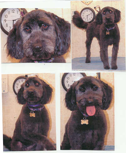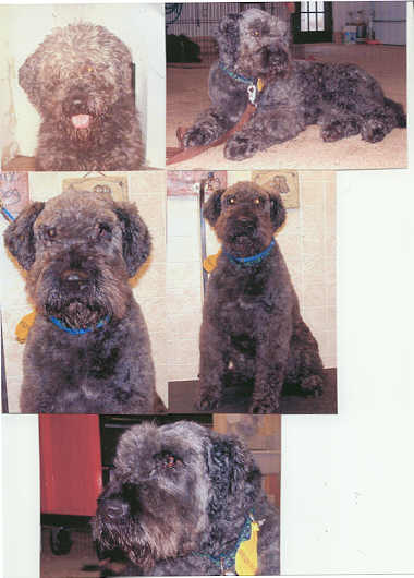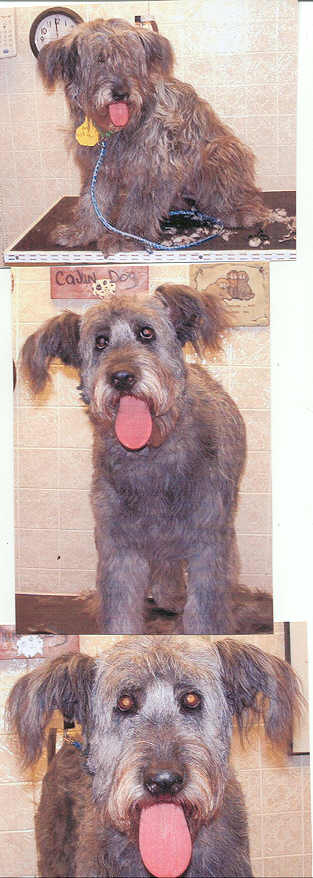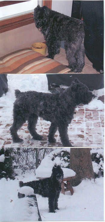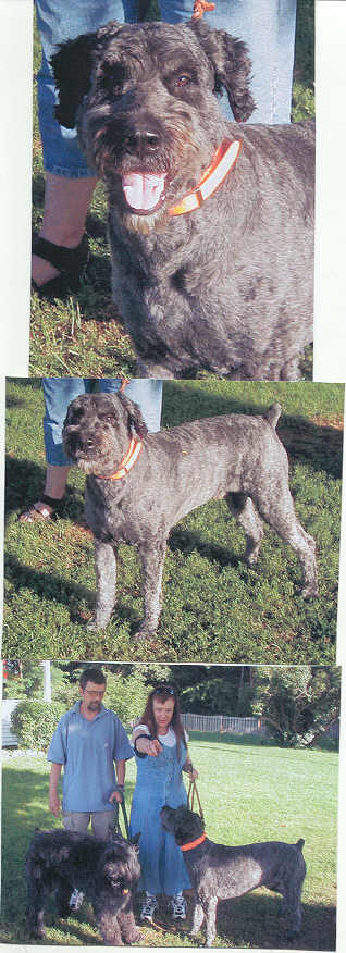 NAME: Gepetto (renamed U-Too) BREED: Bouvier des Flandres GENDER: Male (neutered) AGE: 2 Years Young. WEIGHT: 70# COLOR: Gray brindle, natural ears and tail. RESCUED: From the Cheboygan County Humane Society. PERSONALITY: The picture on your top left is Gepetto's mug shot that was taken at the shelter. The other pictures were taken shortly after he was groomed. When we had Gepetto groomed we found out that he had an entropiad eyelid and had it surgically corrected. For those that don't know what that is - it is when the eyelid turns under slightly but just enough that the eyelashes irritate the eye and make it water. Gepetto is a very sweet and cuddly guy, housetrained, very lovable, quite loyal and affectionate. He gets along fine with other dogs, he is better now with males since he was neutered. Gepetto can be bull-headed at times, but is easily swayed with a biscuit, treat or kind word, otherwise he minds quite well. He is fairly low-key, very relaxed and quiet. A really good boy. Must have a completely fenced and secure yard. UTD on all vaccinations, heartworm negative. Not cat friendly. **UPDATE: Gepetto (U-Too) was adopted 2/19/05 by a very loving family in Waterford, MI. U-Too not only has a new loving family but also has a new brother named Smokey, an 8yro Bouvier **RECENT UPDATE: We just received an email from Gepetto's forever Mom. Evidentally they were undecided what to rename him (they weren't too kean on the name he had from the start - it just didn't fit him). While trying to come up with an appropriate new name they all like they kept on saying things like "come on Smokey and "you too" so it stuck! They are all very happy they chose to adopt a rescue rather than purchase a puppy. They also said "U-Too is now secure, calm, happy and just like another area rug on the floor". |