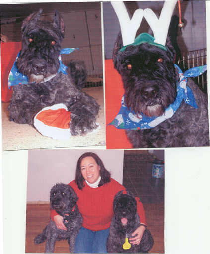 NAME: Chewy BREED: Bouvier des Flandres GENDER: Female (spayed) AGE: 2 yro. WEIGHT: 78.8# COLOR: Black brindle, docked & cropped RESCUED: PERSONALITY: **UPDATE:Chewy was adopted 1/29/05 by a very loving family in Beverly Hills, MI. These wonderful people adopted their female Bouv, Kuma, from us about five years ago. They just recently had to say goodbye to their 16yro Dalmation and the entire family was in desperate need of another companion. Here are pictures of Chewy with her reindog antlers on, and Chewy with her new sister Kuma and her new "Forever Mom". |