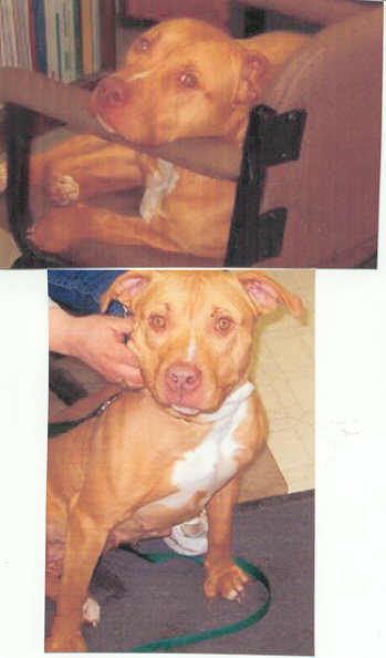 NAME: Ginger II BREED: Staffordshire Bull Terrier GENDER: Female (spayed). AGE: approx 18 months WEIGHT: # COLOR: Fawn and white RESCUED: PERSONALITY: Can you please help me? My name is Ginger, and yes I am a Pit Bull - but I am not the kind you hear about every day. I am at the Cheboygan Animal Shelter. They have hoped and prayed that a kind and loving person would adopt me but it hasn't happen yet and my time is just about up. I am a really good girl (they call me an absolute doll) and that is why they have been hanging on to me. They even offered to drive me wherever I needed to go - as long as it is a great home. So I must be really special. I was found as a stray and the public kept calling the shelter, but they could never catch up with me. Eventually several people were able to surround me and the animal control officer went in for the "capture". I was tired of eating off the streets and wondering where I could safely rest my body at night. I took one look at the animal control officer and ran so fast towards him that I almost knocked him down and drowned him with my kisses. I was so glad to be saved that I was all tail wags and kisses! Everyone who meets me is startled until they REALLY meet me. When the shelter is closed I am allowed to run loose within the building. My favorite thing is laying in the office chair, or at the feet of the person at the desk. I just want to be with someone. I love other dogs, especially puppies and am actually afraid of cats. I love children - but like any muscular dog - should be placed with someone who is very familiar with my breed and who will thoroughly enjoy me. A Pit Bull is not a dog for a first time dog owner. We have to be socialized constantly - both with animals and people. We really are a loving dog when properly handled. Again, I am a SUPER dog, but I am also a bully breed and have to be handled by a strong person with "bully breed knowledge". I desperately need a home, but it has to be the right one!! If you are, or know of such a person - please, please, pass this info along - and contact either Carmen or Mary at cheboyganpets@freeway.net. I am UTD on all vaccinations. It's not my fault that I am a Pit Bull and have to suffer the stigma that is associated with my breed. It's not fair that I should have to face the only alternative left for me if no one adopts me. Please if you can find it in your heart to give me a chance, you will never regret it. All I ask for is someone to call my own **UPDATE:Ginger was adopted by a wonderful family in Northern MI. |