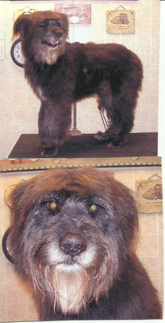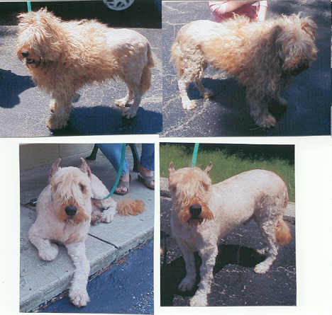 NAME: Gucci II BREED: Bouvier des Flandres GENDER: Male (neutered) AGE: 4-5 Yro. WEIGHT: COLOR: Fawn, cropped ears, natural tail RESCUED: From Franklin County Animal Shelter, Columbus, OH. PERSONALITY: Gucci has been adopted twice and returned due to his "acting out". Although he has been a perfect gentleman at the farm, he tends to forget his housetraining and manners if given the opportunity. Therefore he MUST go to a Bouvier saavy adopter that has a lot of love and patience and is willing to give him the opportunity to adjust to his new situation. As you can tell from the before and after pictures - Gucci was a definite "diamond in the rough" when he was rescued. He looked like a matted "lion dog". He had maggots living on his entire rear end and the shelter shaved him down from the ribs back just to get rid of the maggots and medicate him. With us he apears housetrained, very lovable once he gets to know you, gets along great with other dogs and older children. We have never before come across a Bouvier that was cropped and not docked - if anything they are docked and not cropped - so this was a first for all of us. We would like to thank Judy for springing him from the shelter and bringing him to Dayton, OH for us. We would especially like to thank Maureen for working miracles with her clippers and grooming him so we were able to see just how gorgeous a dog he really is. After he was groomed he acted like a new dog - so proud and relaxed - finally being able to move without all the mats pulling on his skin. Gucci is UTD on all vaccinations. Not cat friendly. Must have a completely fenced and secure yard. **UPDATE:Gucci II was taken to his new forever home in Okemos, MI on 1/21/05. His new Mom came down to the farm with her daughter, met and fell in love with Gucci. |