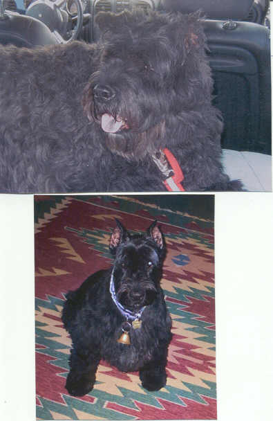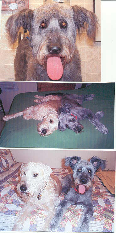 NAME: Buddy & Scruffy BREED: Standard Schnauzer (mix?) GENDER: Male's AGE: 2-3 yro. WEIGHT: Buddy 35#, Scruffy 27# COLOR: Silver & gray, natural ears & tails RESCUED: PERSONALITY: Hi, my name is Buddy (the bigger boy) and my brother’s name is Scruffy (the smaller and shy one). We were surrendered to a shelter in Oklahoma because our Dad is being deployed overseas. We were purchased and have lived together since we were about 12 weeks old. The shelter thought we were Bouvier/Briard mixes but due to our size and characteristics we are most likely Standard Schnauzers or mixes. Our guardian angel, Tara from Beagle/Lab Rescue in OK, put a hold on us because being owner surrenders we could be euthanized immediately. The law says they have to hold strays for a couple of days but surrenders aren’t given any consideration. If at all possible, we would love to be adopted together – we have never been apart. Tara contacted other rescues to see if they were interested and the shelter allowed her to put a 24 hour hold on us. The interested rescue never showed up and we were three cages away from being euthanized when Tara came and saved us. Second Chance Bouvier Rescue said they would make arrangements to get us transported to Michigan, so we were taken to a vet and boarded until we were neutered and updated on shots. We are both housebroken and would love nothing more than for you to make a permanent place in your heart and home for us. Tara took us to the airport in OK at 5am for our long flight to Michigan. Scruffy and I handled the flight quite well, everyone at Continental Airlines thought we were just the sweetest little things they had ever seen. We cried at first because we had to be flown in separate crates, this was the first time we were ever apart. Once we were picked up at the airport we were so happy to be able to cuddle with each other again. It was touch and go for a while when we didn’t think anyone was going to come for us, but our prayers were answered and her name is Tara. We are very lovable, and walk well on a leash. We get along fantastic with people and other dogs. You must have a completely fenced and secure yard. Heartworm negative. **UPDATE: Buddy & Scruffy were adopted 11/5/05 by an absolutely wonderful, loving and caring woman in Jeffersonville, VT. Because of the distance and the fact that she was so willing to take both of the brothers together we met her in Buffalo, NY. As soon as they saw their new Mom, they knew they had just died and gone to heaven. They could not have ever found a more loving Mom than the one they now have. |