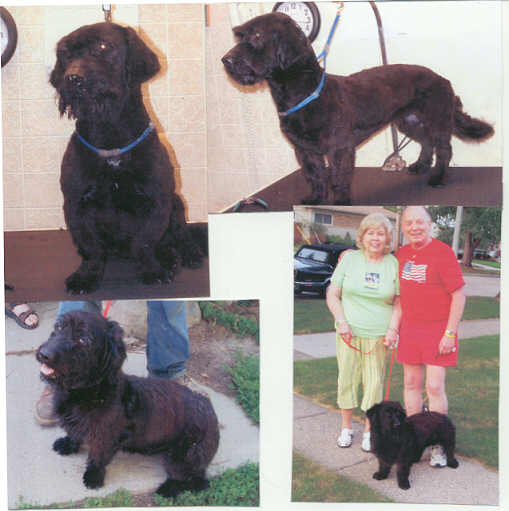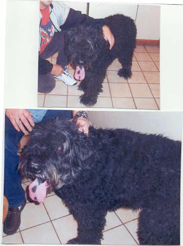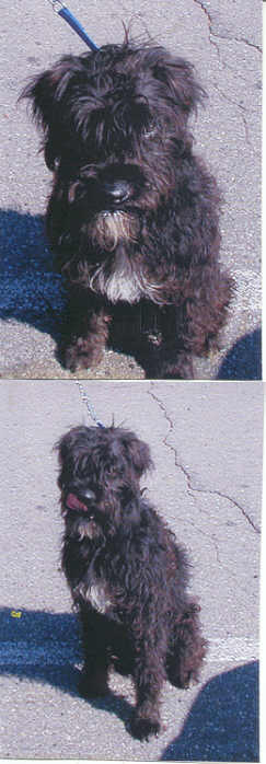 NAME: Touche (renamed TRAMP) BREED: Bouvier des Flandres (possibly Giant Schnauzer mix)? GENDER: Male (neutered) AGE: 1 year young. WEIGHT: approx. 40# COLOR: Black, natural ears and docked tail, white goatee and chest blaze. RESCUED: Kansas City, MO PERSONALITY: Touche is such a dear sweet boy. He was found by animal control hiding in a garbage can. We drove down to save him and bring him back to Michigan. When we got him back and took him to the vets, we thought there was a possibility that he had Warblers disease due to the fact that he "warbled" when he walked. He tested negative for Warblers, but when the x-rays came back we found out that his poor little body had been riddled with BB's. The vet thinks that someone used his precious little body for "target practice"; and there is a strong possibility that there might be a BB lodged in a muscle or close to a nerve that is causing his odd gait. Touche is a dear, sweet boy that truly deserves a wonderful loving home. He is great with other dogs and meets everyone with love and enthusiasm. He is housetrained, but will probably need a little refresher course just to keep him on track. He has been through so much, and deserves nothing less than all the love and attention he obviously has missed out on in his very short life time. Must have a completely fenced and secure yard. UTD on all vaccinations, heartworm negative. Not cat friendly. **UPDATE: Touche was adopted 2/11/05 by a very loving and compassionate woman in Colts Neck, NJ. She had just lost her beloved "Bear" but was willing to make room in her heart and home for sweet Touche |