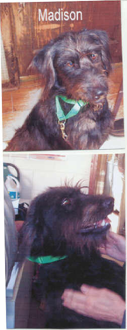 NAME: Katie (renamed Gracie) BREED: Bouvier/Briard mix? GENDER: Female (spayed) AGE: 9-10 months young. WEIGHT: app. 50# COLOR: Silver-gray,erect ears and natural tail. RESCUED: From Genesee County, MI PERSONALITY: Dear Katie was found huddled in the culvert of a drainage ditch, lovingly laying on top of her brother who had been hit and killed by a car. Who knows how long she had been there. She was wet, cold, terrified, but still trying to comfort, protect and keep her brother warm. When we took her to the vet she had a severe urinary tract infection - which we successfully treated with medication. Katie has made such a wonderful adjustment from the terrified, starving little waif that she was - to a loving, attentive little girl that would make anyone a wonderful and endearing companion. Katie is housetrained, freshly groomed and ready to make a difference in someone's heart and home. Katie has the looks and personality of a "Hollywood-Disney" dog. Just one look at that precious face and you can't help but smile. The top picture is the way she looked when we picked her up, the next two were after she had been groomed and brushed - what a difference. Katie gets along great with people and other dogs. UTD on vaccinations. Must have a completely fenced and secure yard. **UPDATE:Katie was adopted 2/5/05 to a very loving and compassionate family in Manchester, MI. Katie has a new brother named Duffy (Wheaton Terrier) who has been mourning the loss of his beloved companion, Mattie (Cocker Spaniel). Katie and Duffy hit it off very well. Katie had just recently lost her brother, and Duffy recently lost his sister so they both needed each other for the same reasons. **MOST RECENT UPDATE: Here are a couple of pictures of Gracie (aka Katie) with her new brother Duffy. As you can see they have bonded quite well. Gracie is happy & healthy and is quickly learning in her training class. ![]() |