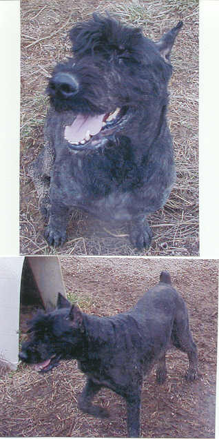 NAME: Max BREED: Bouvier des Flandres/Sheepdog mix. GENDER: Male (neutered) AGE: 5-6yro. WEIGHT: 75# COLOR: Black, docked tail, natural ears. SURRENDERED: By family that could no longer take care of him due to medical conditions. PERSONALITY: Max has a wonderful personality and disposition. He gets along with other female dogs and came from a family with six children. Max was supposed to be a purebred Bouvier that was purchased from a breeder in Warren, MI - according to the people that surrendered him – however he is not. Upon taking him to our vet, we also found out that he is heartworm positive and is currently being treated. Neat and clean in his crate. COMPLETELY FENCED AND SECURED YARD REQUIRED. UTD on all vaccinations. Definitely not cat friendly. **UPDATE: Max was adopted 2/19/05 by a very loving family that drove up to get him from Millersburg, IN |