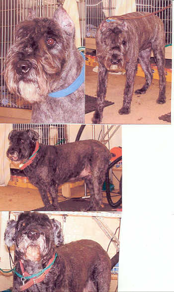 NAME: Fletcher BREED: Giant Schnauzer (possibly Bouvier mix?) GENDER: Male (neutered) AGE: born 8/1/04 WEIGHT: # COLOR: Black, natural ears & tail RESCUED: BIO: Hi there, my name is Fletcher. I was surrendered to the Cheboygan Humane Society by my family because they didn’t have a fenced yard and I love chasing things. They were afraid I might chase the wrong thing at the wrong time and end up being hit by a car. I am very friendly, intelligent, loving and outgoing. I would like nothing more than to bless your family with my love and companionship. I do enjoy car rides, after all I made a 5+ hour ride from Cheboygan to the rescue farm with no problems at all. I get along fantastic with other dogs and love people. I would be best suited in a family without toddlers due to my size and age. I am housetrained. You must have a completely fenced & secure yard. UTD on all vaccinations - heartworm negative. Not cat friendly. **UPDATE:Fletcher was adopted 6/30/06 by a wonderful family from Menasha, WI. They brought Bear (who they adopted from us last year) with them for the meet & greet. All went well and they went to the motel to get a couple of hours sleep before returning home. All four of them slept in the same bed. |