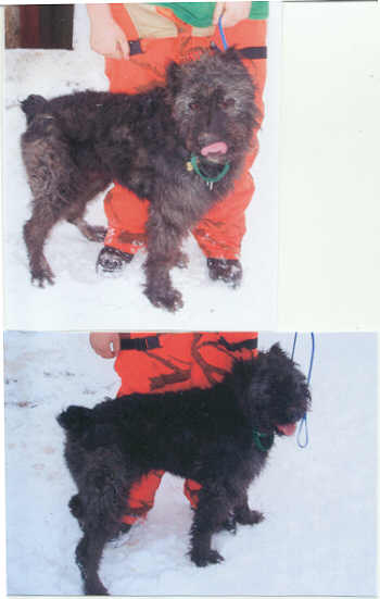 NAME: Ruby BREED: Bouvier des Flandres GENDER: Female (spayed) AGE: 4 yro WEIGHT: 75# COLOR: Black, docked tail, natural ears RESCUED: BIO: Hi, my name is Ruby and I was surrendered by my family in Sault Ste Marie, MI because they didn't have enough time to spend with me. I tested positive for heartworm, was treated and now have a clean bill of health. I am housetrained, I get along fabulously with other dogs and absolutely love children and people in general. I am a really good girl, I just want to please. I will prove to you that just a little kindness can go a long way with me. I am UTD on all vaccinations. Not cat friendly. You must have a completely fenced and secure yard in order to adopt me. **UPDATE:Ruby's dreams came true on 5/20/06. She was adopted by a very loving and compassionate gentleman in Kalamazoo that had adopted one of our rescues, Flossie, last year. Regretfully Flossie had to be helped to the Rainbow Bridge on 5/18/06. This gentleman has had many Bouviers in the past. Ruby met her new Forever Dad and new Bouv Brother Angus and it was a match made in heaven. Ruby will never be able to take Flossie's place, but will certainly help fill the void left in both their hearts with Flossie's passing. |