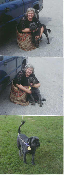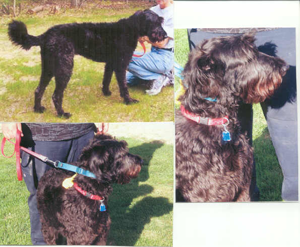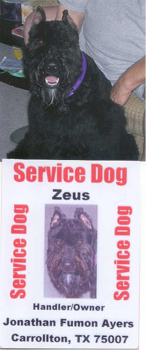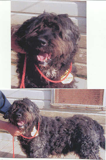 NAME: Zeus BREED: Bouvier des Flandres GENDER: Male (neutered) AGE: 6 months WEIGHT: 31# COLOR: Black, docked & cropped RESCUED: BIO: Hi, my name is Zeus and I was surrendered by my Mom because she was relocating and couldn't take me with her. My Mom drove me all the way from VA to MI to make sure that I would get the very best home available. I am housetrained, intelligent, very loving and just love to play. I get along with everyone and everything. I love car rides and attention (lots and lots of it). I am heartworm negative, UTD on all vaccinations. Must have a completely fenced and secured yard. **UPDATE:Zeus was adopted 5/30/06 by a very excited and loving family that was willing to drive all the way from Carrollton, TX to Michigan to adopt him. When they realized we would not put any of our rescues in the air, without hesitation they gassed up their car and headed for Michigan. Everyone has made it back to TX safe and sound and couldn't be happier. **MOST RECENT UPDATE: Had so many beautiful pictures of Zeus, decided to take all the old ones off and replace them with these pictures. We are all so very proud of Zeus, with permission from his Dad, this is a picture of his Service Dog Tag. Zeus turned into one lovely boy and he makes us all very proud. |
