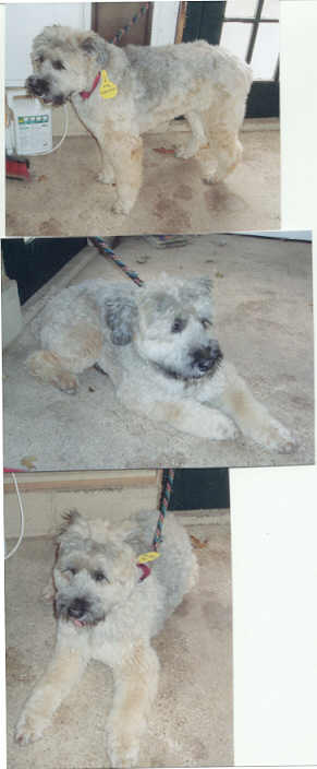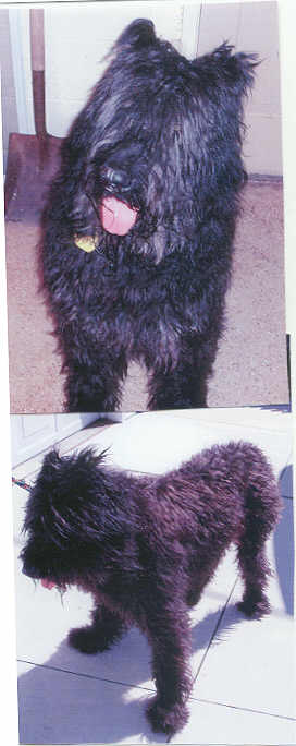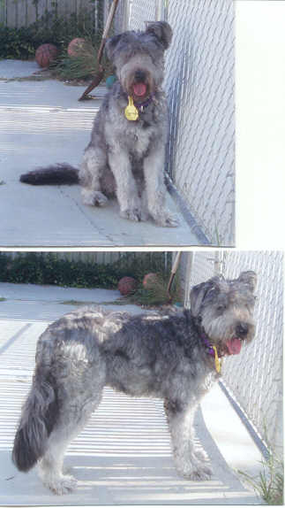 NAME: Buford BREED: Bouvier des Flandres GENDER: Male (neutered) AGE: 3 years old WEIGHT: approx 70# COLOR: Dark gray brindle, docked tail, natural ears BIO: Hello there, my name is Buford. I was rescued from the Floyd County Animal Shelter in Prestonburg, KY. A family found me wandering on their property and was nice enough to take me in. Regretfully, his neighbors cat and I did not see eye to eye and the neighbor took a hammer and threw it at me and hit me in the head - so I left the area immediately. A couple of weeks later I showed up again and the neighbor threatened to shoot me on site if he ever saw me again. Fearing for my life - the kind people that originally befriended me took me to the shelter hopeing to save my life. Everyone at the shelter was in awe as to what a good boy I am. I am housetrained, good with other dogs, absolutely adore people, love car rides and walk very well on a leash. My favorite past-time is to put my head in your lap, look up at you with my big brown eyes, and completely melt your heart and soul. The pictures on the left are "before" my haircut and "after" my haircut. I had the run of the shelter, never bothered anyone and no one bothered me. If you are looking for an absolute gem of a dog, you can stop looking when you come to me. I am well mannered and aim to please. I am, however, very prey driven when it comes to cats, squirrels and small varmints. You must have a completely fenced and secure yard. UTD on all vaccinations, heartworm negative. Not cat friendly. **UPDATE:Buford was adopted 7/9/06 by an absolutely wonderful family that drove down from Chicago, IL. This is Buford's lucky day. He not only has a female Bouvier sister named Dumplin, but also has a new forever Mom and Dad and two teenage sisters to love him. |