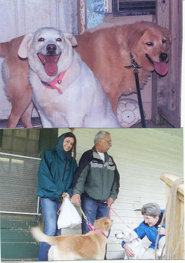 NAME: Cinnamon (renamed Abby)& Sugar (renamed Lily) BREED: Lab/Retriever mixes GENDER: Females (spayed) AGE: 5yro WEIGHT: COLOR: Cinnamon - Golden/Red, Sugar - White SURRENDERED: To a high-kill shelter due to death of owners BIO: These two girls are inseperable. They were dropped off at a high-kill shelter because their owners had passed away and the family members didn't want them. No one could bear the thought of them being put down just because they lost their owner. Regretfully, no one even bothered to tell us their names so we had to name them. They are both very sweet girls and they do need to be adopted together. They are both housetrained, get along great with other dogs and people. They are both UTD on vaccinations and heartworm negative. Must have a completely fenced and secure yard. Am assuming not cat friendly. **UPDATE:Well today was the day that Cinnamon & Sugar have been dreaming of. A wonderful and caring family from Livonia, MI came out and adopted the two of them together. The girls were so excited to be going home that everyone got kisses. |