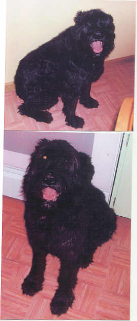 NAME:Sadie (bottom two) BREED: Bouvier des Flandres GENDER: Female (spayed) AGE: 11 yrs young WEIGHT: COLOR: Black, docked tail & natural ears BIO: Hi everyone, our names are Abbey and Sadie. We are both housetrained. We were surrendered to rescue because my Dad had the opportunity of a lifetime and had to relocate and was unable to take me and my older sister Sadie with them. They were devastated when they brought us out to the rescue farm, but at least they loved us both enough to want the very best for us. I am sure that there is someone out there that could love us as much as our former family did (and always will). It would be wonderful if someone could open their heart and home to the both of us. We had to say goodbye to our family and would be devastated if someone didn’t want to adopt the both of us together just because of Sadie’s age. You must have a completely fenced & secure yard. UTD on all vaccinations - heartworm negative. Not cat friendly. **UPDATE:Fantastic news!!! A very warm and loving family from Carmel, IN came out to the farm on 5/9/06 to look at Abbey. Abbey was on the porch and Sadie was in the house carrying on something terrible because they were separated and she just knew something was going on. This very loving and compassionate couple could not bring themselves to separate the girls and decided to take them both home with them. We cannot thank them enough for their compassion and understanding. We could not have asked for a more loving forever home than the home that they will be giving to both Abbey & Sadie. Not many people would have been willing to take on a senior citizen - but this couple did - and we have the highest admiration and gratitude for their compassion and commitment. This is one(two) adoption(s) that we will never forget. |