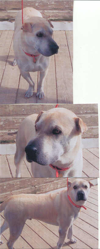 NAME: Nike BREED: Chinese Shar-Pei / Lab mix GENDER: Male (neutered) AGE: just turned 5yro WEIGHT: approx 50# COLOR: White w/beige highlights SURRENDERED: By family that had to part with him due to financial reasons PERSONALITY: Hi there, my name is Nike. I am housetrained and get along great with other dogs and people. I am a real people pleaser. I am a lot better looking in person - pictures just don't do me any justice. I am UTD with all vaccinations and heartworm negative. Must have a completely fenced and secure yard. Not cat friendly. **UPDATE: Adopted Jan. 2006 |