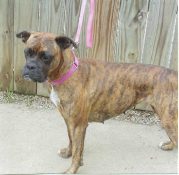 NAME: Vallus BREED: Boxer GENDER: Female (spayed) AGE: 4-5 yro. WEIGHT: # COLOR: Fawn brindle, black mask, docked tail, natural ears RESCUED: BIO: Hi there, my name is Vallus (they call me Val for short). I was surrendered by my family because they had to relocate and couldn’t bring me with them. I was very timid when I arrived, but am working on changing that. I am very low-keyed and as sweet as you could ever imagine. I love children, adults and other dogs. I am housetrained. With a lot of love and understanding I am sure I could make you a very loving companion. I wasn’t shown a lot of attention but I am willing to give you 150% of mine if you decide to open your heart and home to me. You must have a completely fenced & secure yard. UTD on all vaccinations - heartworm negative. Not cat friendly. **UPDATE:Vallus (Val) was adopted 5/14/06 by a wonderful and loving gentleman in Westland, MI. She is an only child and is loving every minute of it. She adores her new forever Dad and he just loves her to death. |
