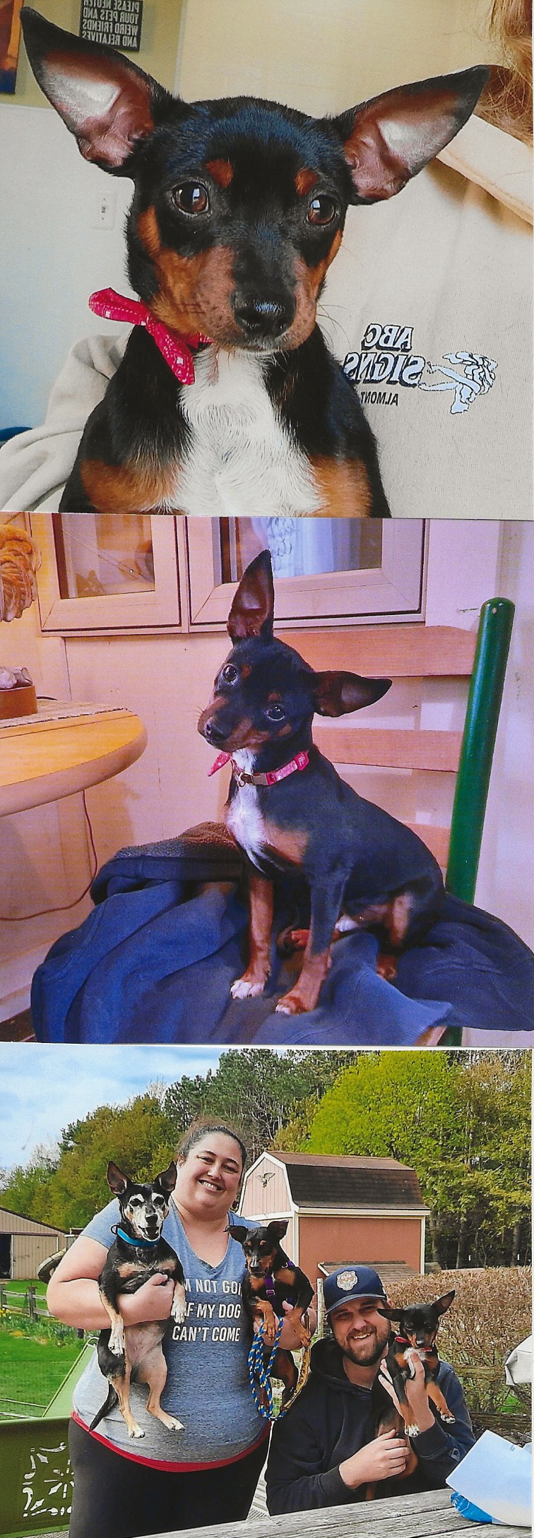 NAME: CHICO BREED: Chihuahua mix GENDER: Male (neutered) AGE: born approx. 11/27/20 WEIGHT: 10# COLOR: Tri-color (brown, black, white) BIO: Well, hello there. Please meet Chico. Isn’t he just about the cutest little thing you have laid your eyes on in quite a while? Chico was rescued along with his brother out of a cardboard box in a parking lot by a young man that couldn’t keep him, but couldn’t leave him with the person getting rid of him. Chico gets along great with other dogs and cats, as long as they want to play or cuddle. Because Chico is so tiny, you would have to be extremely careful of him around small children. Not because he would harm them, but he is so fragile they could very easily “break” him. Chico is crate-trained and pretty much house-trained. His Foster Mom is working on that, but he will need some positive reinforcement in that area. Chico just loves to cuddle and be loved. He is young enough that you can train him to be the perfect little gentleman that you want. Chico is very loving and easily trainable. Because of his age and size, he would be best suited with children at least 10 years of age or older. Chico is UTD on all vaccinations, on heartworm preventative and micro-chipped with a lifetime registration. Chico is currently being fostered in Almont, MI. You MUST have a completely fenced and secure yard in order to adopt any of our rescues **UPDATE: Chico was adopted 4/24/21 by a fantastic family in Belleville, MI. Chico not only has a new Forever Mom & Dad, but also has a new Min Pin brother and sister to keep him company. |