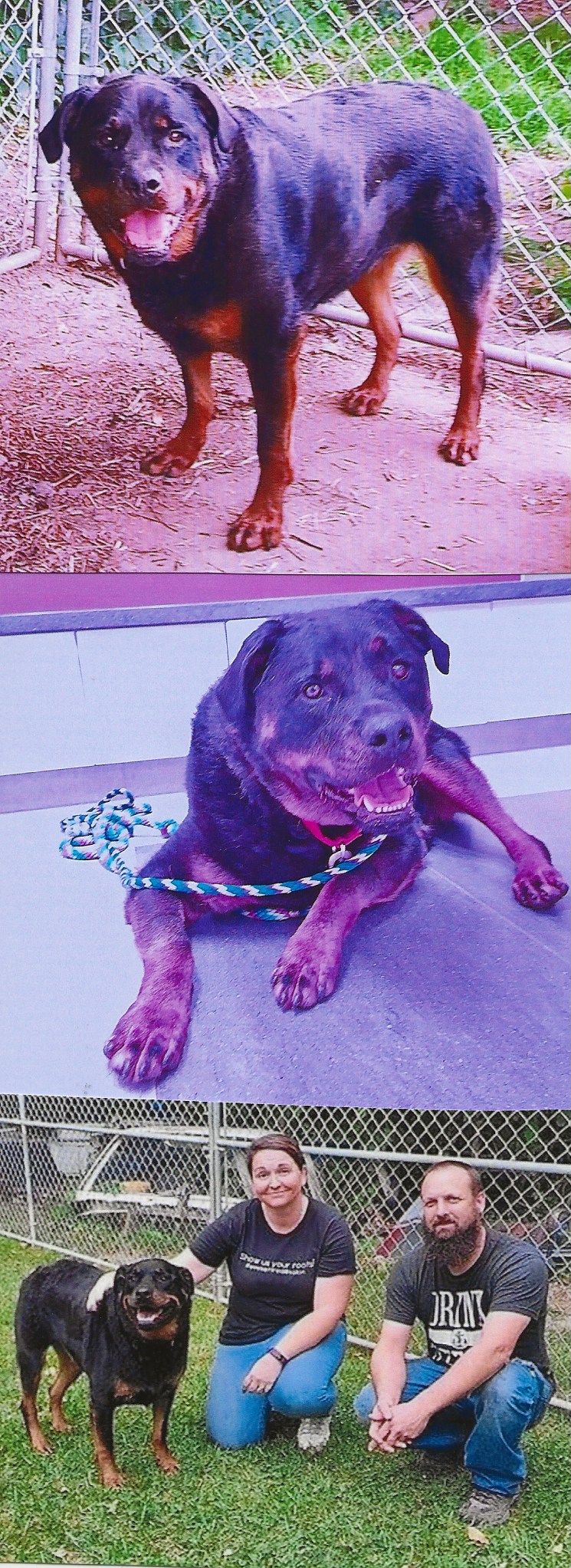 NAME: STELLA BREED: Rottweiler GENDER: Female (spayed) AGE: 6/18/15 (approx) WEIGHT: 102# COLOR: Black & Rust, docked tail BIO: Hello big dog lovers! Please take a look at sweet Stella, who was a victim of animal abuse. We received a call from a concerned citizen regarding a dog that was being dragged down the gravel road by her owner. Evidently she had collapsed due to heat stroke, and her limp body was being dragged home because she would not/could not get up. The police were called and they took possession of her at that time because the owner didn’t feel she needed to see a vet. She was so badly scraped from being dragged and unable to move that they decided she would have to be taken to an emergency vet in hopes of saving her life. We were called to see if we would be responsible for her vet bills and take her in if they transported her. Of course, we agreed. Upon arrival at the vets, she was immediately x-rayed and given IV fluids to rehydrate her. Stella was in the ICU for a couple of days, trying to recover from her tragic ordeal. Stella is such a sweetheart. She loves people and loves giving kisses. She would be awesome as an only child. She is very grateful for every ounce of love and affection that she receives. She does have a very loud bark and would be the perfect burglar deterrent. She loves being outside and is perfectly content in a large fenced area for part of the day. A real plus is that she is not afraid of fireworks or thunderstorms. We have found that she definitely does not like cats. Due to her size, we wouldn’t recommend her to be around small children unsupervised. Stella is looking for a forever family that knows and understands her breed. Stella is UTD on vaccinations and tested negative for heart worm. Stella is currently being fostered in Westland, MI. You MUST have a completely fenced and secure yard in order to adopt any of our rescues. **UPDATE: Well 9/12/21 proved to be a very happy day for Stella. Stella was adopted by a very loving family in Almont, MI. As you can tell in the bottom picture, everyone is “all smiles” about the situation. |