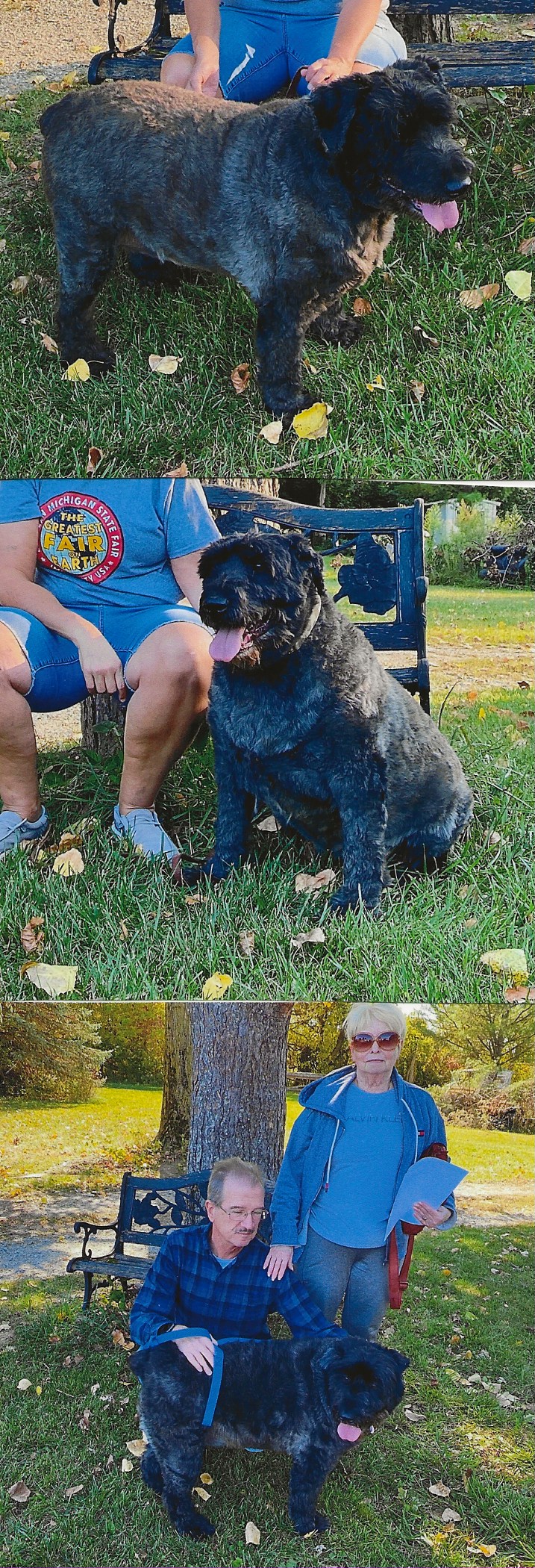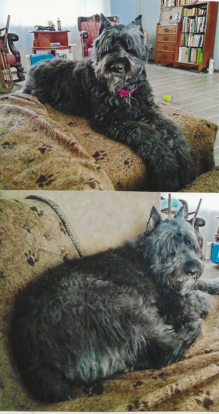 NAME: Mishka BREED: Bouvier des Flandres GENDER: Female (spayed) AGE: Born 5/5/17 WEIGHT: 95# COLORS: Dark Gray Brindle, docked tail and natural ears BIO: Hello everyone. We would like you to meet Mishka. Mishka & Lucas are a pair of bonded siblings. They were surrendered to us by an elderly couple that were moving out of the country. As much as they were loved, their former owners did not feel it would be in the dog’s best interest to fly them to the pineapple state. These two are inseperable and we agreed that we would NOT split them up in order to adopt them, so please do not even ask us to consider it. Mishka is housetrained and walks well on leash. Mishka gets along great with other animals, and absolutely adores kids. As mellow as she is and because of her size, we would not recommend her with young children. Mishka is not high prey drive and appears to show little to no interest in cats. She is UTD on all vaccinations, heartworm negative (and on preventative), spayed and microchipped. Because of her size, we had her thyroid checked just in case (Bouviers’ are prone to having thyroid disease) and the levels came back fine. Her former Dad used to give her pork rinds as a treat and she loved them. However she was considered obese by our vet when we took her in and managed to shave about ten pounds off of her with proper food and treats. For her build, she could probably lose at least another five pounds ?. Upon further examination, we also found that Mishka has Entropion Eyelid on her left eye. She is scheduled for surgery on 6/20/22. Mishka is fairly laid back is a real cuddle bug. She loves to be touched and petted. She is perfectly fine laying her head on your feet when you are standing or sitting or watching TV. She does not have as much stamina as her brother but no matter where he is or what he is doing, she has to have sight of him or she gets very anxious. Now that we got some weight off of her, she does have more ambition. You MUST have a completely fenced and secure yard in order to adopt any of our rescues. Mishka is located at our facility in Imlay City, MI. **UPDATE: Misha, along with her brother Lucas, was adopted 7/8/22 by a phenomenal couple from Windsor, Ontario, Canada. The “Dynamic Duo”, as we love to call them, had no reservations whatsoever when meeting their new Mom & Dad. They joined their new Rough Coated Collie “brother”, 12yro cat, 14yro two-legged sister and Grand Dog Mother, who has also been owned by Bouviers. They made it home with no problems and we have already received pictures of them chilling out on their dog beds. |