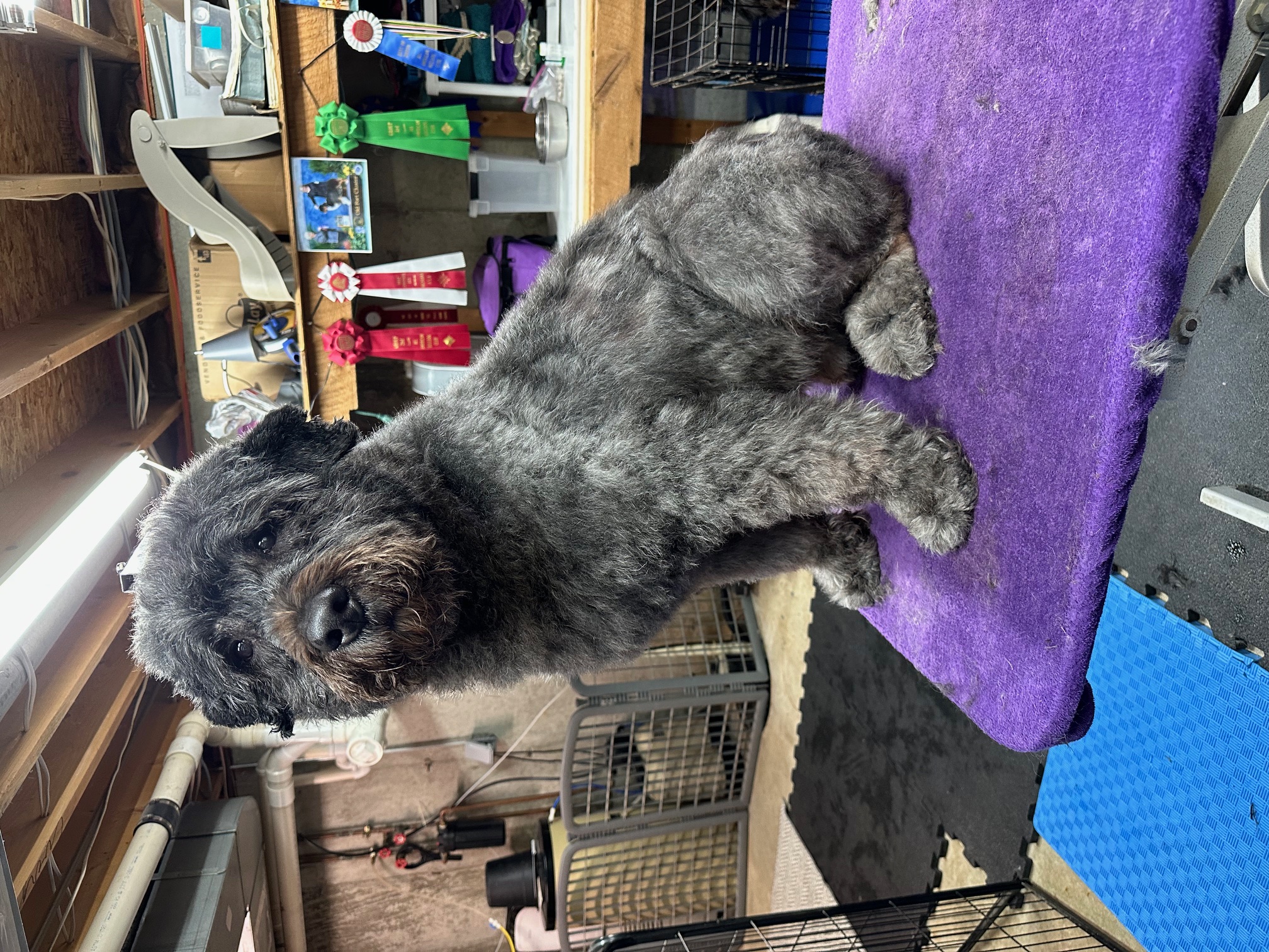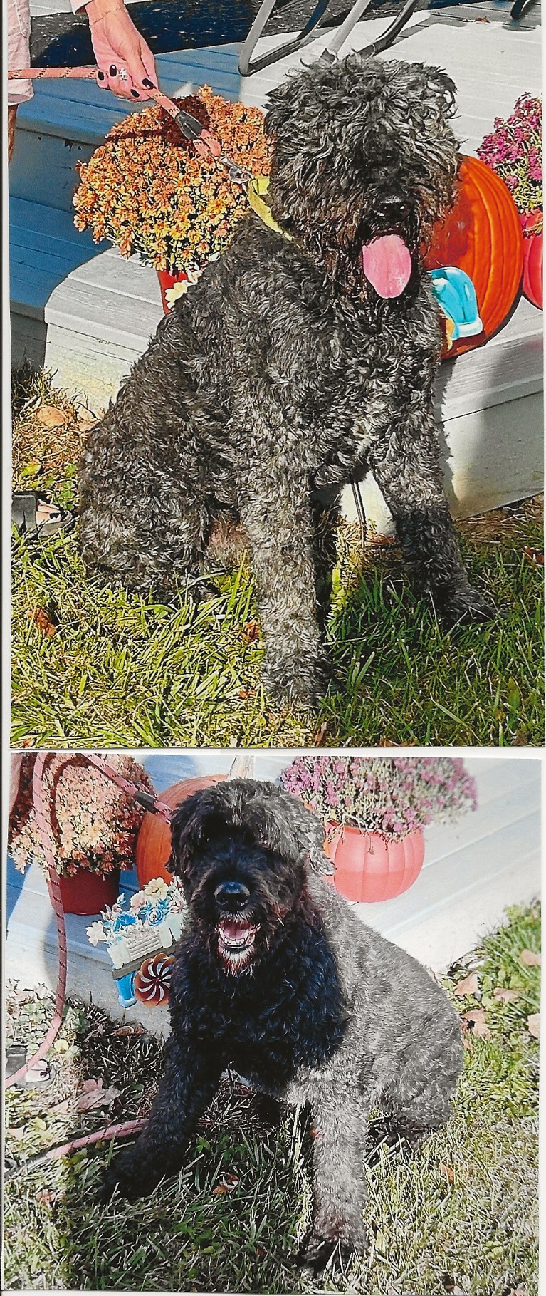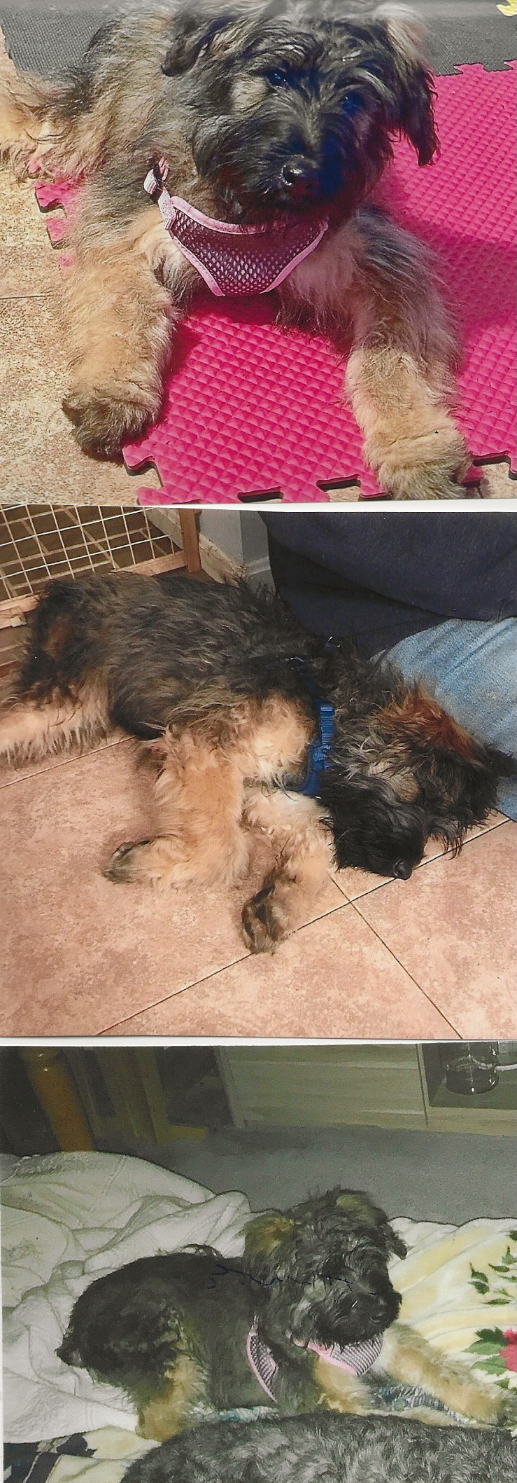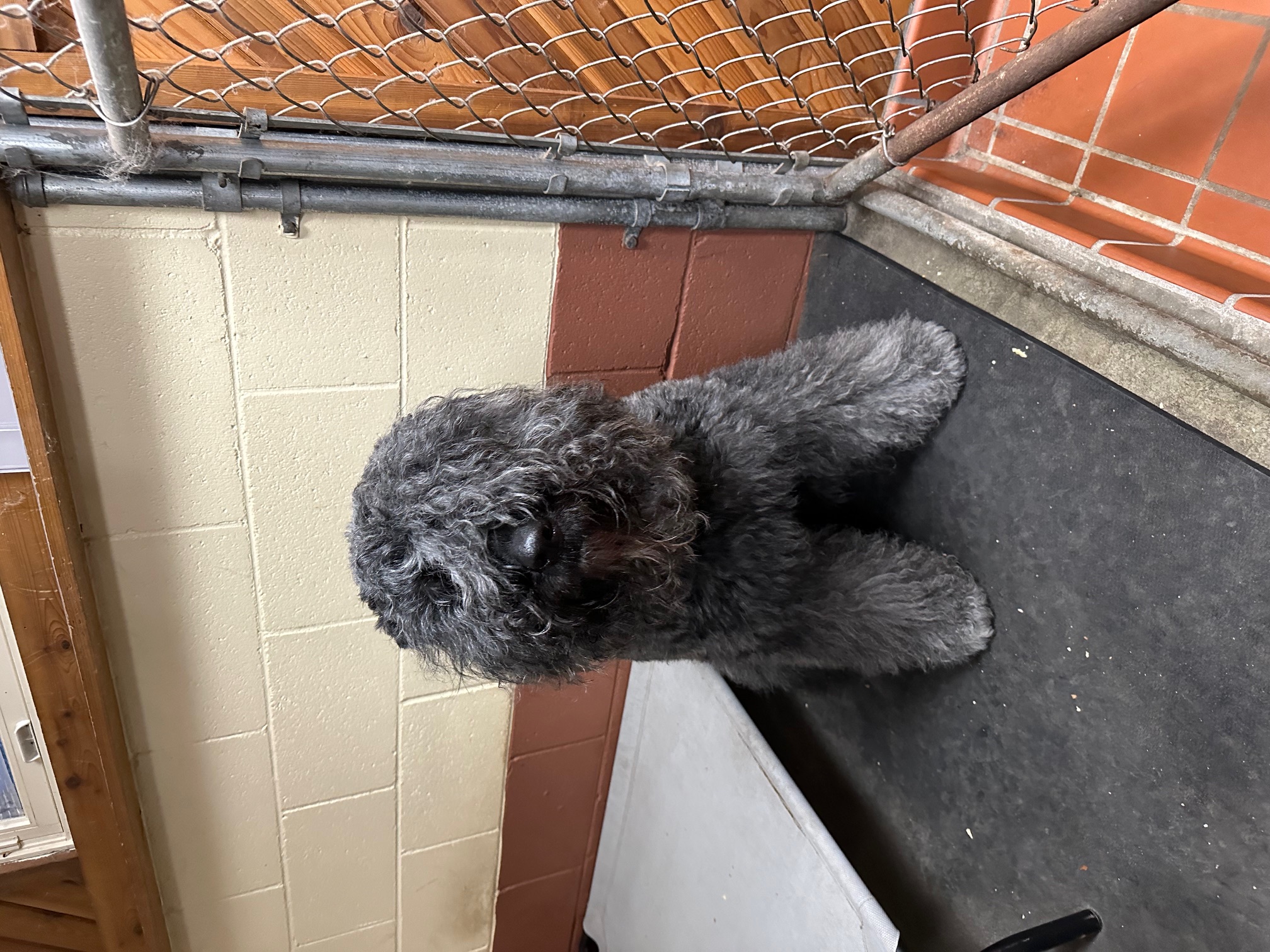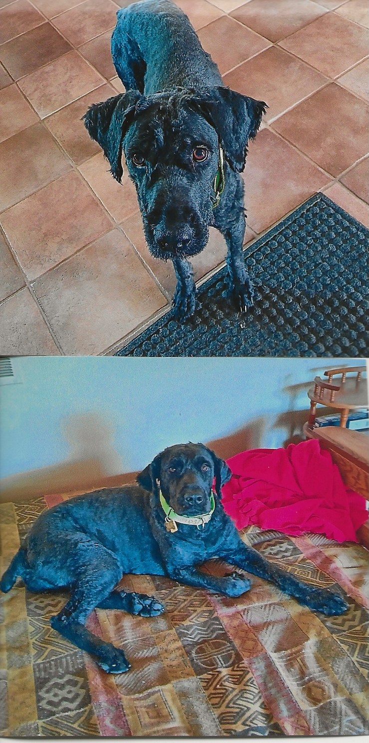 NAME: STORMY (formerly Storm) BREED: Listed as a Bouvier des Flandres mix (now looks like a Labradoodle, once shaved down) GENDER: Female (spayed) AGE: Born 5/25/21 WEIGHT: 56.8# COLOR: Black, docked tail natural ears BIO: Stormy was picked up, along with her running mate, Tugboat, in Highland Park, MI. and transported to the Westland Humane Society. We are assuming they were the two Bouviers (?) that were running loose for a couple of months and they were finally caught. They were so severely matted they both had to be completely shaved down. Once shaved down, they were both skin and bones. Neither of them showed well at the shelter. They were so fearful that it was next to impossible to get them to trust you long enough to give treats or touch them. Miraculously, Tugboat was adopted when I went to the shelter to see them. It took a good hour of throwing treats and talking softly to get Stormy to take a treat out of my hand and gently steel a touch or pet her. Once I was able to pet her, she melted like butter and wanted to be petted non-stop. There were quite a few people there to meet Stormy, thankfully, I was able to pull her. I don’t feel Stormy was ever an indoor pet. You can tell she has had at least one litter. Most likely, Stormy and Tugboat were a backyard breeding pair. Stormy has a “joy stick” docking job on her tail, and still has her dew claws. She was not house trained and acted like she had never seen or heard a television. She is still afraid of her own shadow. I finally got her to play with toys, but she would only play with the “non-squeaky” ones. Stormy gets along well with other dogs and has started wanting to play with them. She is a “counter surfer”. Nothing is safe if it is closer than five feet to the ground. She is also very agile and can go into stealth mode if she doesn’t want you to know what she is up to. Stormy has been spayed, micro-chipped, heart worm tested and on heartworm preventative. **UPDATE: Today, 6/18/24, was Stormy’s lucky day; I adopted her. Stormy has so much baggage that I don’t think she could go through another transition. As I have always done in the past, I adopt the ones that I am afraid will not adjust to another home, thru no fault of their own. I lost my beloved Greta this past January. Greta carried a lot of the same baggage that Stormy has. Hopefully, I can turn her around like I did Greta. Stormy has gained some weight and now LOVES playing with squeaky toys ?. Top pic is after I picked her up. Bottom pic is after being fed properly for a couple of weeks. |